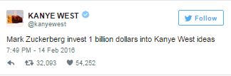Ο τραγουδιστής και σύζυγος της Κιμ Καρντάσιαν έκανε ανεπίσημα πρόταση στον Ζούκερμπεργκ μέσω του Τwitter και του ζητούσε 1 δις δολάρια.