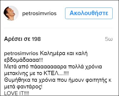 Με λεωφορείο του ΚΤΕΛ ταξίδεψε έπειτα από πολλά χρόνια ο Πέτρος Ίμβριος, ο οποίος ανέβασε σχετική φωτογραφία στον λογαριασμό του στο Instagram.