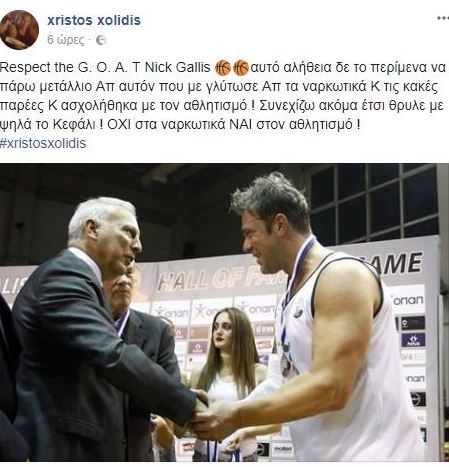Ο διάσημος τραγουδιστής έκανε post στο facebook με φωτογραφία του μαζί με τον Νίκο Γκάλη κι έγραψε: «Respect the G.O.A.T Nick Gallis Αυτό αλήθεια δε το περίμενα ,να πάρω μετάλλιο απ’ αυτόν που με γλίτωσε απ’ τα ναρκωτικά και τις κακές παρέες και ασχολήθηκα με τον αθλητισμό! Συνεχίζω ακόμα έτσι, θρυλε, με ψηλά το κεφάλι! ΟΧΙ στα ναρκωτικά ΝΑΙ στον αθλητισμό! #xristosxolidis».