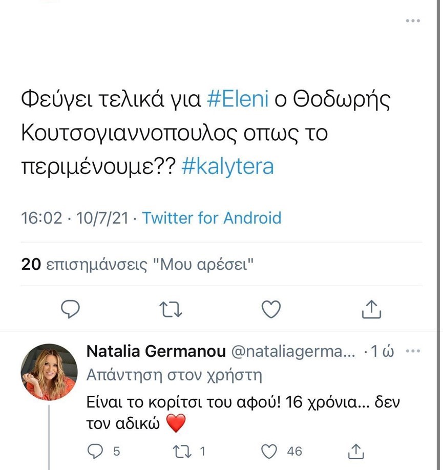 «Φεύγει τελικά για Ελένη ο Θοδωρής Κουτσογιαννόπουλος, όπως το περιμένουμε;», ρώτησε ένα χρήστης του Twitter την παρουσιάστρια με την Ναταλία Γερμανού να απαντά: «Είναι το κορίτσι του αφού! 16 χρόνια… δεν τον αδικώ».