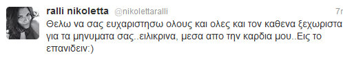 Η Νικολέττα Ράλλη ένιωσε την ανάγκη να ευχαριστήσει μέσα από το twitter όλους όσοι της έστειλαν μηνύματα, ύστερα απο την ανακοίνωση της διακοπής της εκπομπής της.