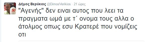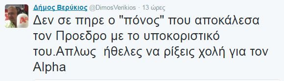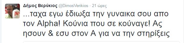 “Αγενής δεν είναι αυτός που λέει τα πράγματα ωμά με τ’ όνομα τους αλλά ο άτολμος όπως εσύ Κρατερέ που νομίζεις ότι …τάχα εγώ έδιωξα την γυναίκα σου από τον Alpha! Κούνια που σε κούναγε! Ας ήσουν και εσύ στον Alpha για να την στηρίξεις. Άντε μπράβο με τις ξινίλες του κάθε δήθεν που τολμάει να αμφισβητήσει τον διαχρονικό σεβασμό μου στον Π. Παυλόπουλο. Άντε μπράβο με τον κάθε πονεμένο που όταν τρώει «πόρτα» από τον Alpha βλέπει ανάμεσα στους …δράκους τον Βερύκιο” έγραψε ο δημοσιογράφος.