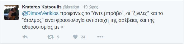 Μόλις αντιλήφθηκε ο Κρατερός Κατσούλης τι έχει ανεβάσει ο δημοσιογράφος στο προφίλ του στο twitter, έσπευσε να κάνει και αυτός τις δικές του αναρτήσεις, προκειμένου να δώσει εκ νέου μια απάντηση στα όσα είπε ο Δήμος Βερύκιος.