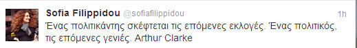 Η Σοφία Φιλιππίδου είναι φανατική του twitter… Ποστάρει τις σκέψεις της αλλά και αποφθέγματα σημαντικών ανθρώπων. Διαβαστε τι έγραψε πριν από λίγο: