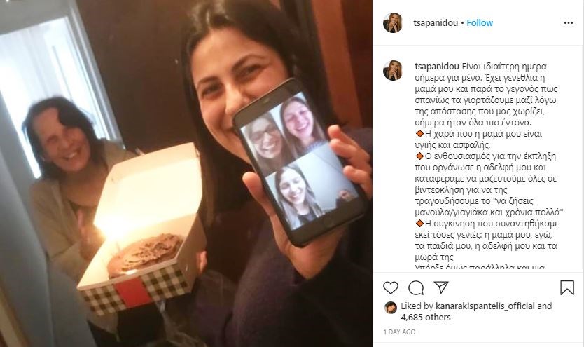 Γενέθλια είχε τις προηγούμενες ημέρες η μητέρα της Πόπης Τσαπανίδου και τα γιόρτασαν οικογενειακώς αλλά μέσω… βίντεοκλήσης, λόγω του κορονοϊού. Η δημοσιογράφος δεν έκρυψε από τους διαδικτυακούς της φίλους τη συγκίνησή της για το γεγονός αναρτώντας στον προσωπικό της λογαριασμό στο instagram ένα στιγμιότυπο από τη γιορτή αλλά και ορισμένες σκέψεις της για τις δύσκολες μέρες που διανύουμε μακριά από τα αγαπημένα μας πρόσωπα.
