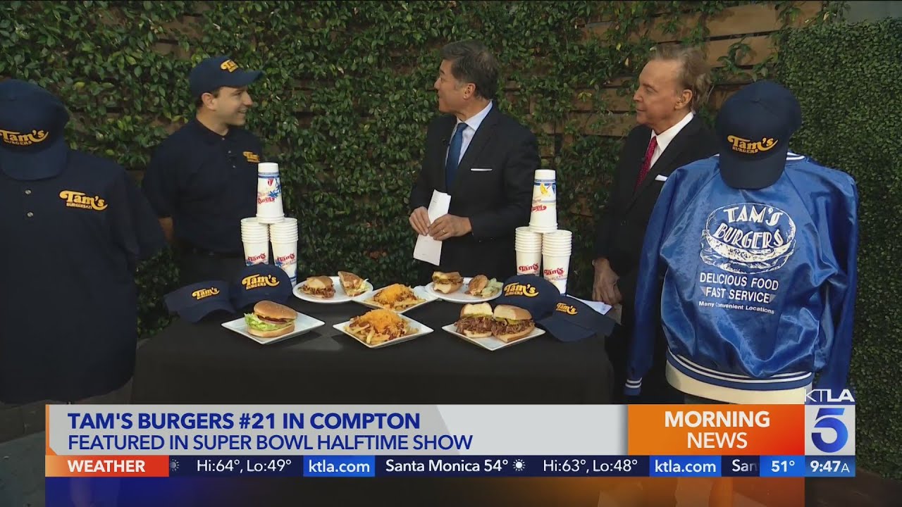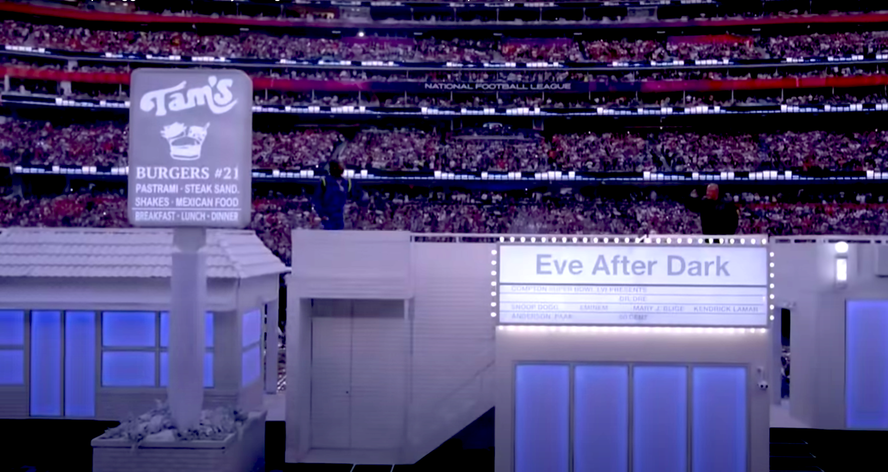 Έτσι λοιπόν στην αναπαράσταση της γειτονιάς, ο Dr. Dre θέλησε να βάλει και μιά ταμπέλα αντίγραφο σαν εκείνη που είχε το αγαπημένο του χαμπουργκεράδικο. Το αξιοσημείωτο είναι ότι τα “Tam’s Burgers” είναι μία επιχείρηση που υφίσταται και σήμερα και είναι ίσως η πρώτη φορά στην ιστορία του Super Bowl, που μια μικρή επιχείρηση διαφημίζεται τόσο δυναμικά μέσα στο περίφημο halftime, χωρίς να πληρώσει και μάλιστα δίπλα σε τόσους μεγάλους σταρς της μουσικής!