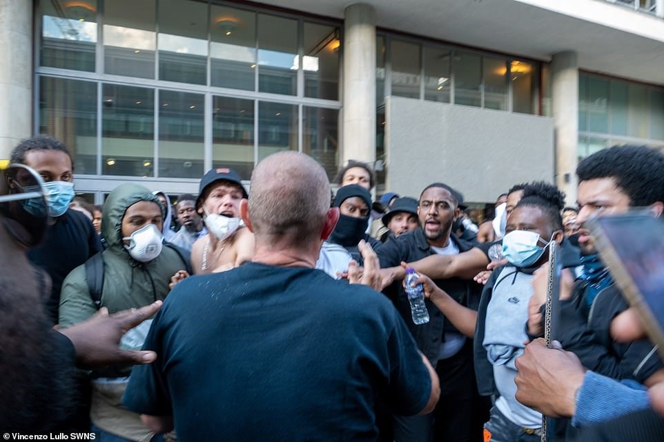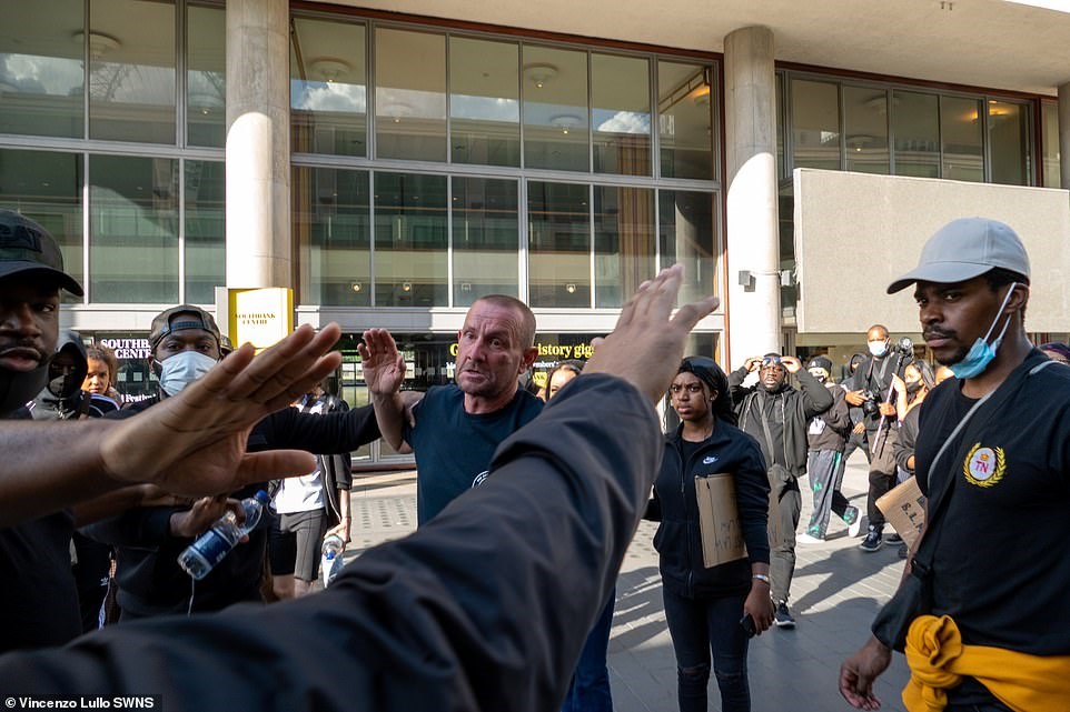 Ιστορική είναι πλέον αυτή η φωτογραφία όπου ο μαύρος ακτιβιστής που συμμετείχε στη διαδήλωση για το κίνημα #BlackLivesMatter διέσωσε τον λευκό εξτρεμιστή, που διαδήλωνε υπέρ των αγαλμάτων στον σταθμό Βατερλό στο Λονδίνο, το Σάββατο. Τώρα έρχονται νέες φωτογραφίες που δείχνουν τις στιγμές που διαδραματίζονταν στιγμές πριν από τη σωτήρια επέμβαση.