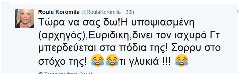 Στο… επίμαχο θέμα τοποθετήθηκε και η Ρούλα Κορομηλά, η οποία έγραψε στο Twitter: «Τώρα να σας δω! Η υποψιασμένη (αρχηγός), Ευρυδίκη, δίνει τον ισχυρό γιατί μπερδεύεται στα πόδια της! Σόρρυ στο στόχο της! Τι γλυκιά!!!».