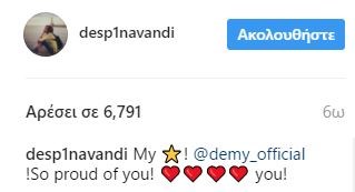 Ωστόσο, οι δικοί της άνθρωποι την υποδέχτηκαν με αγάπη στην Ελλάδα. Μεταξύ αυτών και η Δέσποινα Βανδή, η οποία ανέβασε μια φωτογραφία στο instagram με την Ντέμυ, εκφράζοντας την περηφάνια της την νεαρή τραγουδίστρια.