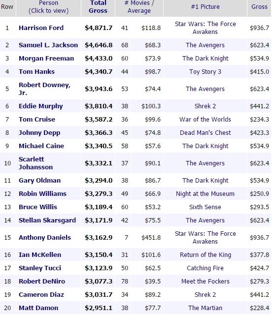 Πλουσιότερος όλων είναι ο Χάρισον Φορντ, ενώ ακολουθούν οι Σάμιουελ Τζάκσον, Μόργκαν Φρίμαν, Τομ Χανκς, Ρόμπερτ Ντάουντι Τζουνριο, Έντι Μέρφι, Τομ Κρουζ, Μάικλ Κέιν και Τζόνι Ντεπ.