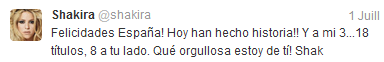 Ευτυχισμένη για την κατάκτηση του Euro από την Ισπανία, αλλά και για την επιτυχία του αγαπημένου της Ζεράρ Πικέ δηλώνει μέσω Twitter η Σακίρα.”Συγχαρητήρια Ισπανία. Σήμερα γράψατε ιστορία. Και το ‘δικό’ μου 3 (σ.σ. το νούμερο του Ζεράρ Πικέ). 18 τίτλοι, 8 με την ομάδα σου. Πόσο περήφανη είμαι για σένα!” έγραψε η Κολομβιανή σούπερ σταρ στον προσωπικό της λογαριασμό στη γνωστή σελίδα κοινωνικής δικτύωσης.Δείτε το… “τιτίβισμα” της Σακίρα