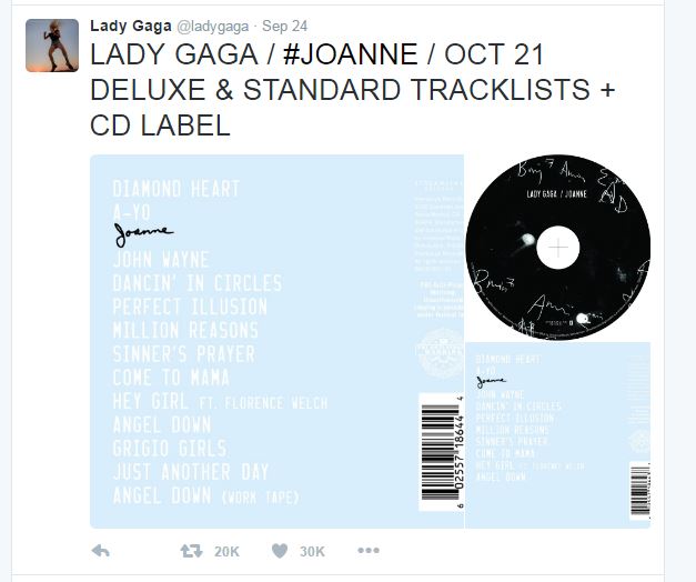 Την ανακοίνωση των τίτλων των τραγουδιών του νέου της άλμπουμ η Lady Gaga την έκανε μέσα από τον προσωπικό της λογαριασμό στο Twitter.
