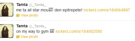 Η Τάμτα ανάρτησε στο Twitter δύο φωτογραφίες την ώρα που κατευθυνόταν προς το γυμναστήριο. Εκτός από την φωτογραφία που είναι μέσα στο αυτοκίνητο, ανέβασε ακόμη μια με τα παπούτσια της και έγραψε: ”Με τα all star μου δεν επιτρέπεται.”