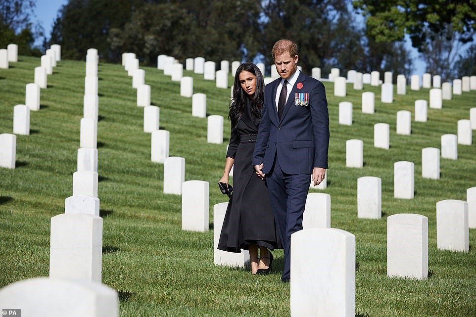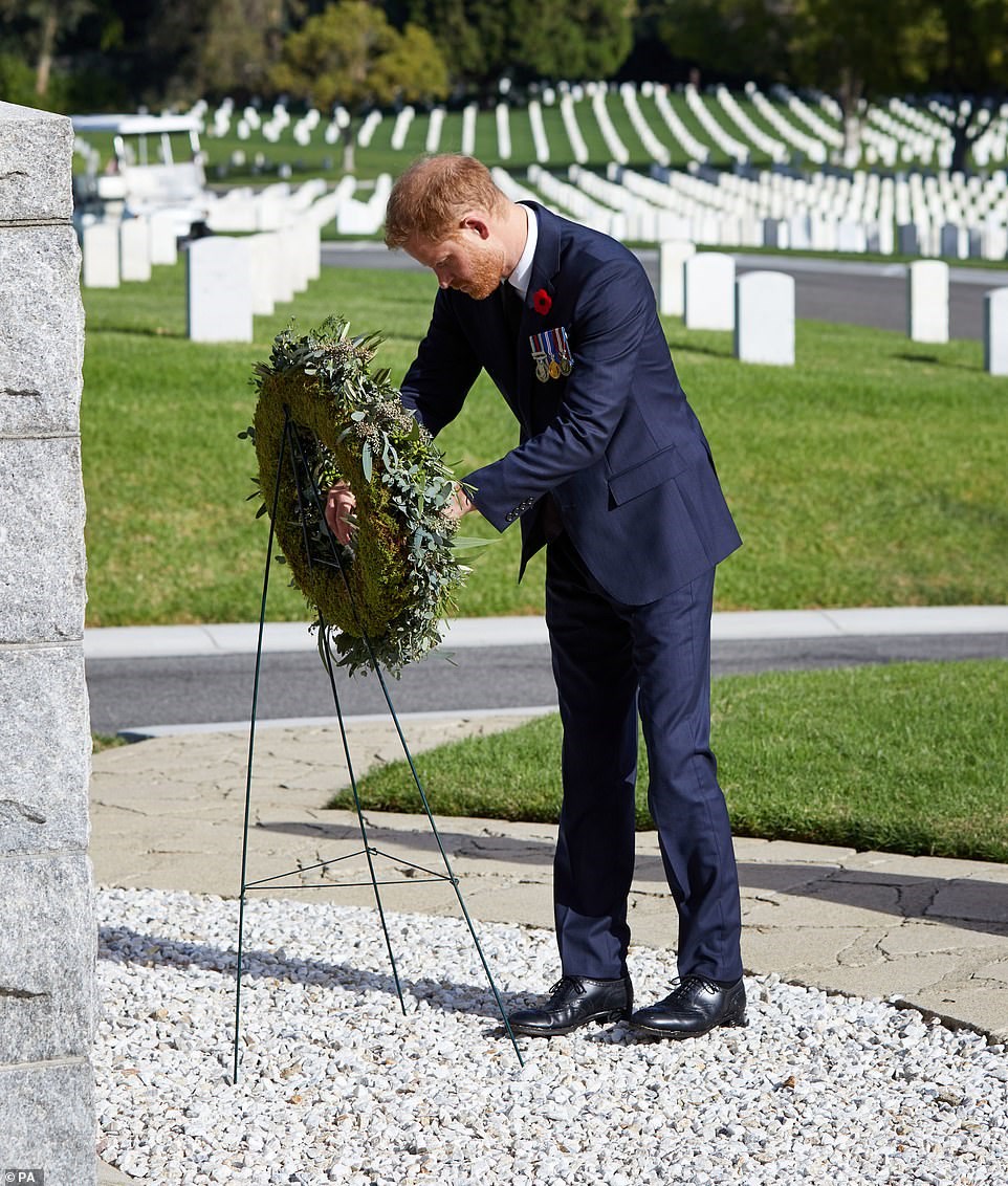 Αφού τα Ανάκτορα Μπάκιγχαμ απέρριψαν το αίτημά του να καταθέσουν στεφάνι εκ μέρους στο μνημείο του Αγνώστου Στρατιώτη στο Αββαείο του Ουεστμίνστερ την Κυριακή Μνήμης, αφιερωμένη στους πεσόντες των Παγκοσμίων Πολέμων και τους βετεράνους, ο πρίγκιπας Χάρι τίμησε μόνος του την ημέρα. Πήρε τη Μέγκαν Μαρκλ που έκοψε λουλούδια από τον κήπο τους και πήγαν στο Εθνικό Κοιμητήριο του Λος Άντζελες για να αποτίσουν τιμή στους πεσόντες στρατιώτες της Κοινοπολιτείας. Άφησαν τα λουλούδια στους δύο τάφους, ο ένας ανήκε σε πιλότο της αυστραλιανής Πολεμικής Αεροπορίας και ο άλλος σε στρατιώτη του καναδικού πυροβολικού. Παράλληλα, άφησαν και στεφάνι σε οβελίσκο στο κοιμητήριο όπου υπήρχε επιγραφή στην οποία αναγραφόταν ” στη μνήμη των ανδρών που προσέφεραν τις ζωές τους στην άμυνα της χώρας τους” Ήταν και οι δύο μαυροφορεμένοι ενώ φορούσαν στο πέτο τους την κλασική καρφίτσα παπαρούνα, το εθνικό λουλούδι της Βρετανίας και σύμβολο των πεσόντων στρατιωτικών. Φορούσαν μάσκες ενώ στη διάρκεια της επίσκεψης στο κοιμητήριο τις έβγαλαν. Η απόρριψη τρου αιτήματος στο Μπάκιγχαμ φέρεται να λύπησε βαθύτατα τον Δούκα του Σάσεξ και έτσι πήρε την απόφαση να ακολουθήσει το εθιμοτυπικό ενώ ζει στο Λος Άντζελες. Έγινε επίσης γνωστό ότι το στεφάνι του , που κόστισε 1.000 λίρες, ξεχάστηκε στα κεντρικά της Βρετανικής Βασιλικής Λεγεώνας. Εκπρόσωπος του Σώματος δήλωσε στη Mail Online ότι τα βασιλικά στεφάνια δημιουργούνται εκ των προτέρων για την περίοδο της Μνήμης και όχι έπειτα από συγκεκριμένα αιτήματα, ενώ αποθηκεύονται για μετέπειτα χρήση. Εκπρόσωπος του ζευγαριού δήλωσε: “Ήταν σημαντικό για τον δούκα και τη δούκισσα να μπορούν προσωπικά να αναγνωρίσουν τη Μνήμη με τον δικό τους τρόπο, να αποτίσουν φόρο τιμής σ’ αυτούς που υπηρέτησαν και σ’ αυτούς που έδωσαν τη ζωή τους. Το ζευγάρι άφησε λουλούδια που η δούκισσα έκοψε από τον κήπο τους, στους τάφους δύο στρατιωτών της Κοινοπολιτείας”. Παράλληλα, ο πρίγκιπας κατέθεσε στεφάνι στο οποίο αναγραφόταν το μήνυμα “σε όλους αυτούς που έχουν υπηρετήσει και υπηρετούν. Ευχαριστούμε”.