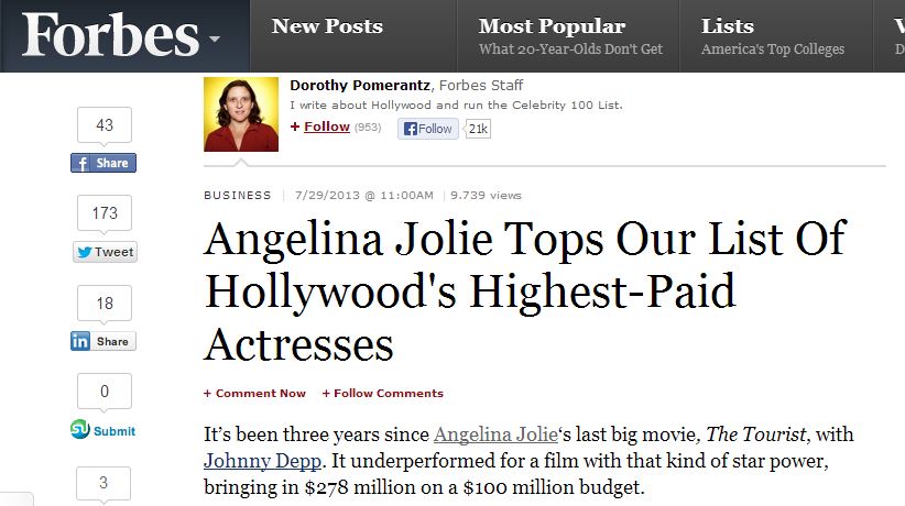 «Το Χόλιγουντ δεν έχει στρέψει την πλάτη του στην Τζολί. Παραμένει μία από τις ελάχιστες ηθοποιούς που μπορούν να ζητήσουν πάνω από 15 εκατομμύρια αμοιβή για τη σωστή ταινία, όπως το Maleficent όπου η Disney ξαναπιάνει το παραμύθι της Ωραίας Κοιμωμένης», σχολίασε η Ντόροθι Πόμεραντζ στο άρθρο της στην ιστοσελίδα του περιοδικού.