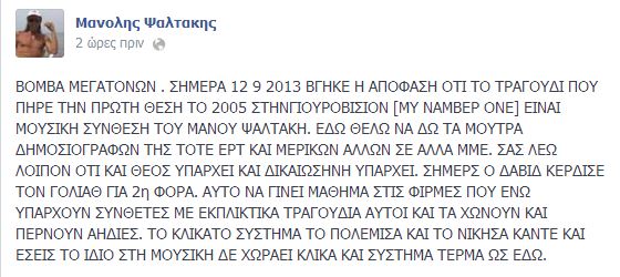 Το νικητήριο τραγούδι της Eurovision 2005, το “My number one”, σύμφωνα με σημερινή απόφαση του δικαστηρίου, ανήκει στον Μανόλη Ψαλτάκη, στον άνθρωπο που διεκδικεί εδώ και οκτώ χρόνια την πατρότητά του.