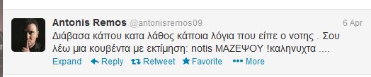 “Διάβασα κάπου κατά λάθος κάποια λόγια που είπε ο Νότης. Σου λέω μια κουβέντα με εκτίμηση: Notis ΜΑΖΕΨΟΥ! Καληνύχτα…”, έγραψε ο Αντώνης Ρέμος στο twitter.