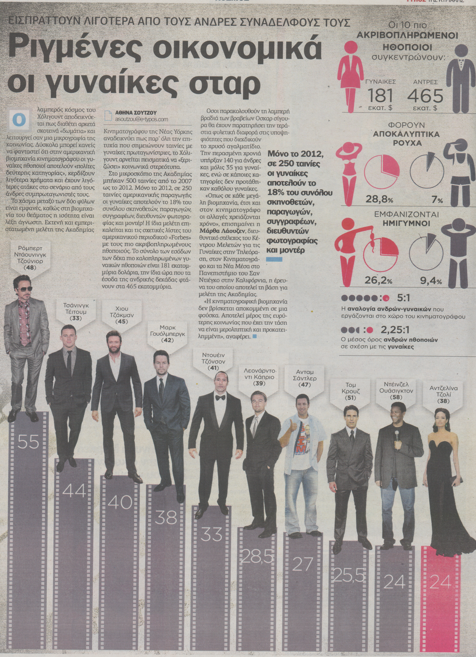 Δύσκολα μπορεί κανείς να φανταστεί ότι στην αμερικανική βιομηχανία κινηματογράφου οι γυναίκες ηθοποιοί αποτελούν “πολίτες δεύτερης κατηγορίας”, κερδίζουν λιγότερα χρήματα και έχουν λιγότερες ατάκες στο σενάριο από τους άνδρες συμπρωταγωνιστές τους.