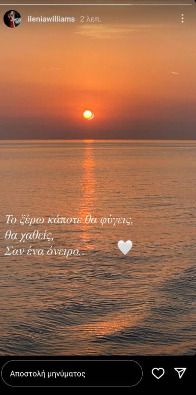 Η Ιλένια Ουίλιαμς ανέβασε στον προσωπικό της λογαριασμό στο Instagram μια φωτογραφία που απεικονίζει τον ήλιο να δύει πάνω από την θάλασσα και έγραψε χαρακτηριστικά: «Το ξέρω κάποτε θα φύγεις, θα χαθείς, Σαν ένα όνειρο». Πρόκειται για έναν στίχο από το μουσικό κομμάτι με τίτλο “Σαν ένα όνειρο”, το οποίο είχε τραγουδήσει ο πατέρας της, μαζί με την Μπέσσυ Αργυράκη.