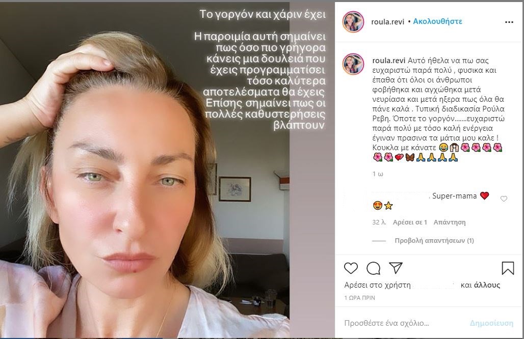Ώρες αργότερα σε νέα ανάρτησή της έγραψε: “Αυτό ήθελα να πω σας ευχαριστώ παρά πολύ, φυσικά και έπαθα ό,τι όλοι οι άνθρωποι φοβήθηκα και αγχώθηκα μετά νευρίασα και μετά ήξερα πως όλα θα πάνε καλά. Τυπική διαδικασία Ρούλα Ρεβη. Όποτε το γοργόν… ευχαριστώ παρά πολύ με τόσο καλή ενέργεια έγιναν πράσινα τα μάτια μου καλέ ! Κύυκλα με κάνατε”.