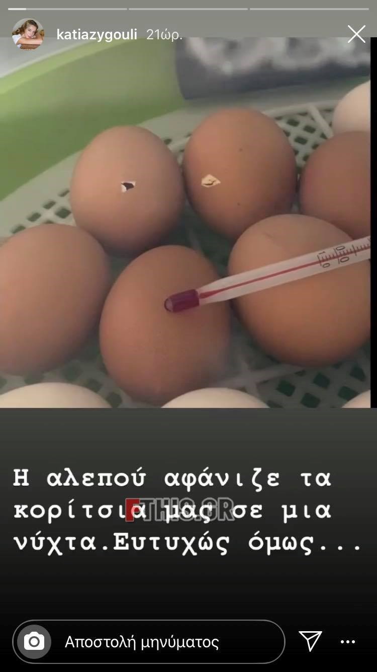 Ο Σάκης Ρουβάς και η Κάτια Ζυγούλη στο σπίτι τους διατηρούν ένα μποστάνι από όπου παίρνουν λαχανικά και ένα κοτέτσι, από όπου τρώνε φρέσκα αυγά καθημερινά. Πρόσφατα, ο γνωστός τραγουδιστής μας είχε ξεναγήσει στο κοτέτσι, μέσω του λογαριασμού του στο instagram. Όμως, όπως έκανε γνωστό η Κάτια Ζυγούλη μέσω τους Instagram μια αλεπού έφαγε τις κότες τους. Ευτυχώς, είχαν φροντίσει να κρατήσουν τα αυγά και έτσι είχαν “γεννητούρια”, αφού υποδέχθηκαν μικρά κοτοπουλάκια στο κοτέτσι τους.