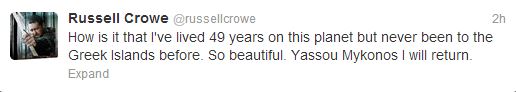Ο διάσημος ηθοποιός Russell Crowe βρέθηκε στη Μύκονο, έκανε τις διακοπές του και δεν το έμαθε ποτέ κανένας, μέχρι πριν από λίγα λεπτά, επειδή ο ίδιος το έγραψε στο twitter του.