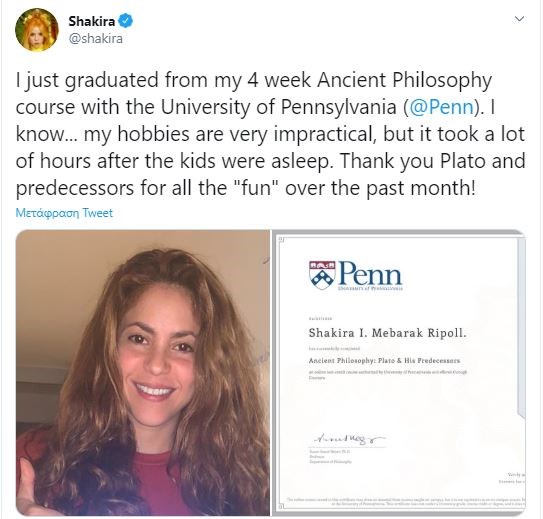 Η Σακίρα ανέβασε στον προσωπικό της λογαριασμό στο Twitter φωτογραφίες που αποδεικνύουν την επιτυχία της. “Μόλις ολοκλήρωσα το μάθημα Αρχαίας Φιλοσοφίας από το Πανεπιστήμιο της Πενσυλβάνια και το οποίο είχε διάρκεια τεσσάρων εβδομάδων. Ξέρω τα χόμπι μου είναι πολύ ουτοπικά, αλλά χρειάστηκαν πολλές ώρες αφότου τα παιδιά είχαν κοιμηθεί για να τα ολοκληρώσω. Ευχαριστώ τον Πλάτωνα και όλους τους προκατόχους για όλα όσα έμαθα και τον ευχάριστο χρόνο που πέρασα όλο τον μήνα”, έγραψε η διάσημη τραγουδίστρια.