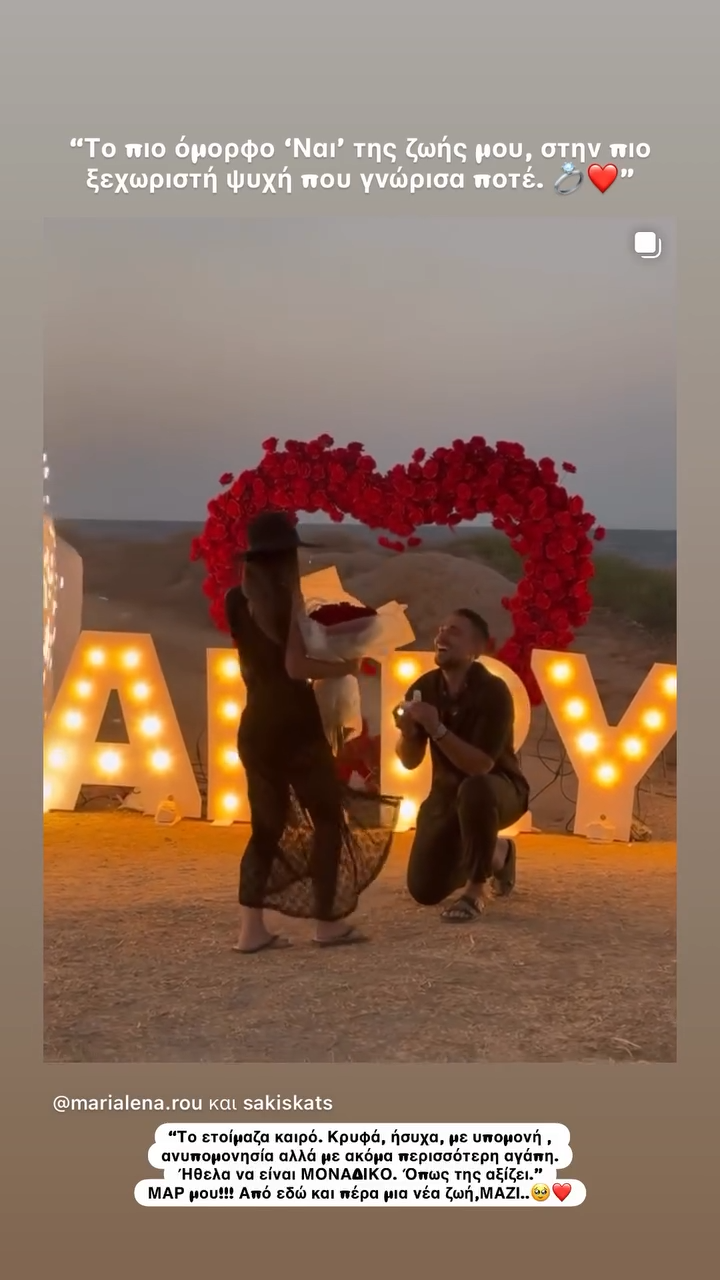 Μία παραμυθένια πρόταση γάμου έκανε ο Σάκης Κατσούλης στη Μαριαλένα Ρουμελιώτη, στη διάρκεια των καλοκαιρινών διακοπών τους. Την ευχάριστη είδηση γνωστοποίησε η μέλλουσα νύφη, μέσα από μία όμορφη ανάρτηση στο προφίλ της στο Instagram, το βράδυ της Κυριακής (27/7).