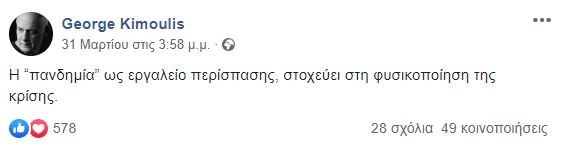 Σάλο στο διαδίκτυο προκάλεσε η ανάρτηση που έκανε ο Γιώργος Κιμούλης στον προσωπικό του λογαριασμό στο facebook σχετικά με τον κορονοϊό. Ο γνωστός ηθοποιός και σκηνοθέτης θέλησε να σχολιάσει την κατάσταση που βιώνει ο κόσμος εξαιτίας της εξάπλωσης του κορονοϊού με το εξής μήνυμα: «η πανδημία ως εργαλείο περίσπασης, στοχεύει στην φυσικοποίηση της κρίσης», βάζοντας εισαγωγικά στη λέξη πανδημία.
