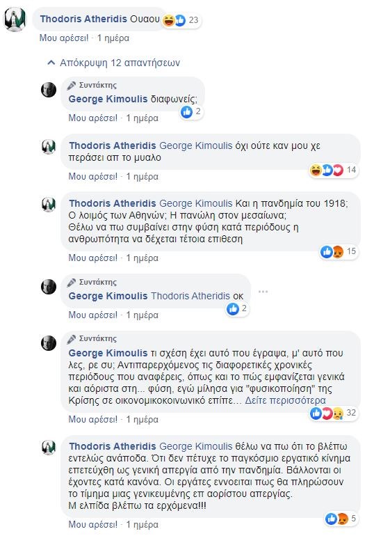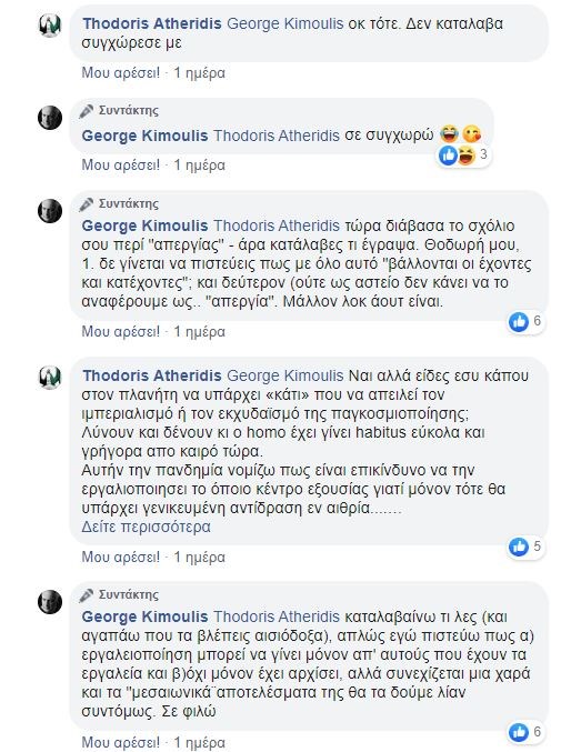 Η συγκεκριμένη ανάρτηση προκάλεσε την άμεση αντίδραση του Θοδωρή Αθερίδη, με αποτέλεσμα να ξεκινήσει ένας διαδικτυακός διάλογος μεταξύ τους.
