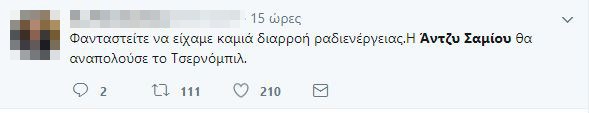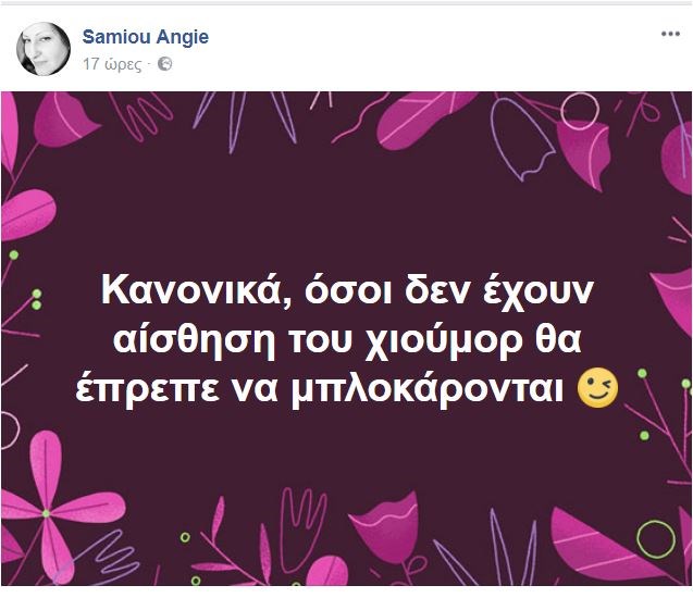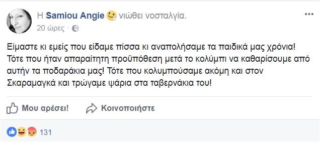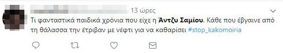Σάλο έχει προκαλέσει στα social media η ανάρτηση της τραγουδίστριας Άντζυς Σαμίου, στον προσωπικό της λογαριασμό στο facebook, σχετικά με τη ρύπανση των υδάτων στον Σαρωνικό, μετά τη βύθιση του δεξαμενόπλοιου «Αγία Ζώνη ΙΙ».«Είμαστε κι εμείς που είδαμε πίσσα κι αναπολήσαμε τα παιδικά μας χρόνια! Τότε που ήταν απαραίτητη προϋπόθεση μετά το κολύμπι να καθαρίσουμε από αυτήν τα ποδαράκια μας! Τότε που κολυμπούσαμε ακόμη και στον Σκαραμαγκά και τρώγαμε ψάρια στα ταβερνάκια του», έγραψε χαρακτηριστικά η τραγουδίστρια, και όπως ήταν φυσικό, προκάλεσε θύελλα αντιδράσεων.