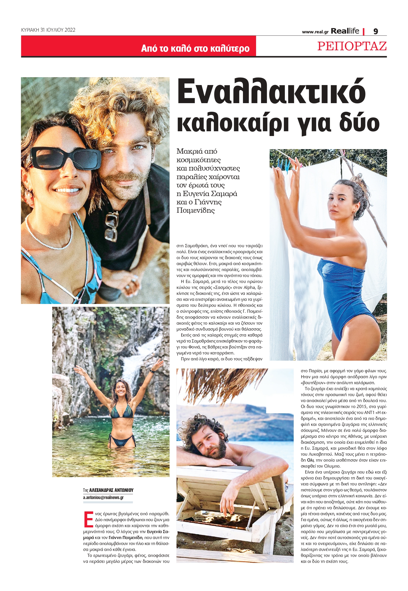 Ένας έρωτας βγαλμένος από παραμύθι. Δύο πανέμορφοι άνθρωποι που ζουν μια όμορφη σχέση και χαίρονται την καθημερινότητά τους. Ο λόγος για την Ευγενία Σαμαρά και τον Γιάννη Ποιμενίδη, που αυτή την περίοδο απολαμβάνουν τον ήλιο και τη θάλασσα μακριά από κάθε έγνοια.