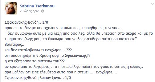 Με ανάρτησή της στον προσωπικό της λογαριασμό στο Facebook, η Σαμπρίνα τάσσεται υπέρ του Νότη Σφακιανάκη στο θέμα που δημιουργήθηκε με τις δηλώσεις του για την Χρυσή Αυγή και την απόφαση της Δέσποινας Βανδή να αποχωρήσει από το σχήμα.