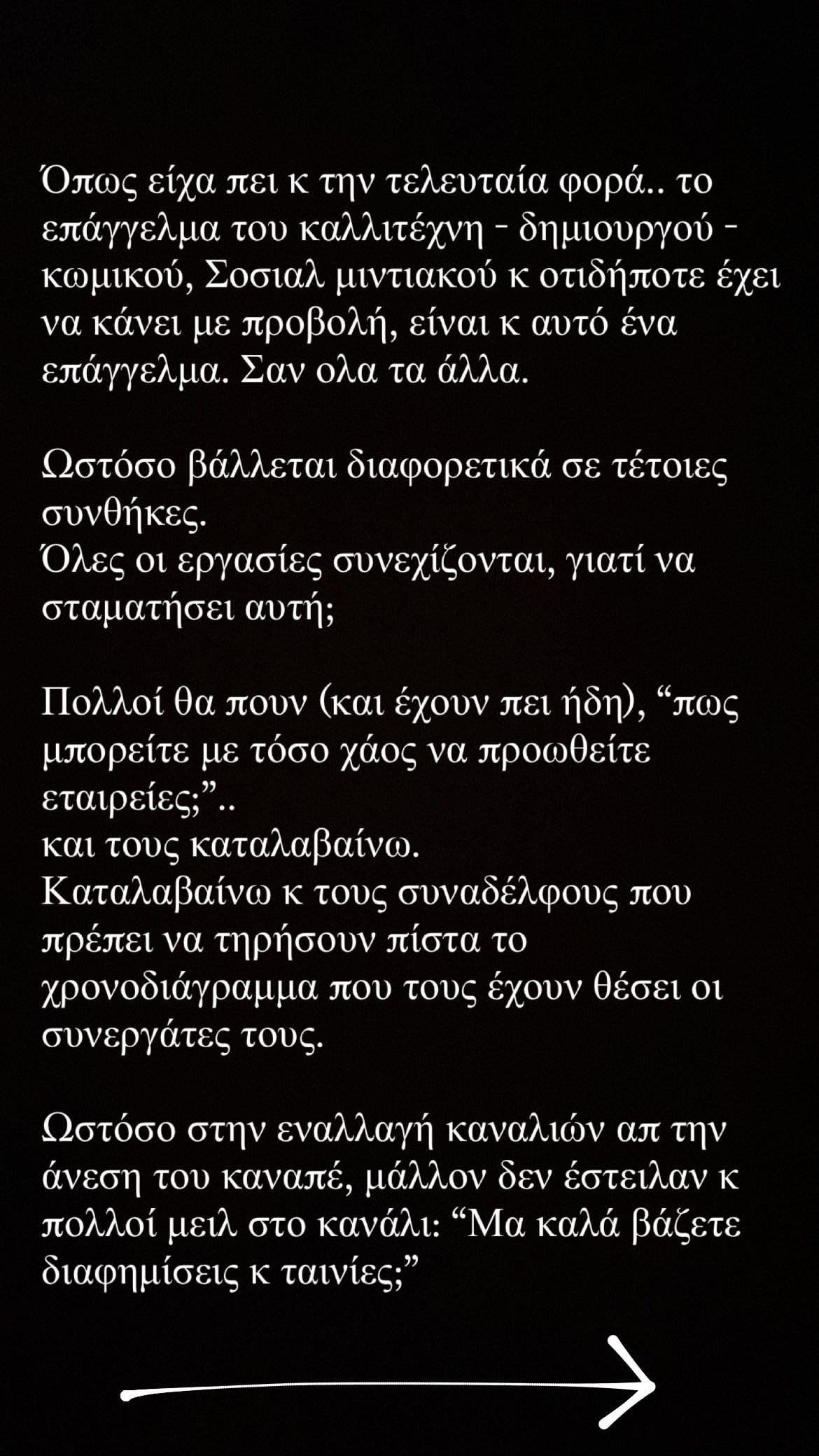 «Όπως είχα πει και την προηγούμενη φορά… το επάγγελμα του καλλιτέχνη – δημιουργού – κωμικού, Σόσιαλ μιντιακού κ οτιδήποτε έχει να κάνει με προβολή, είναι και αυτό ένα επάγγελμα. Σαν όλα τα άλλα.