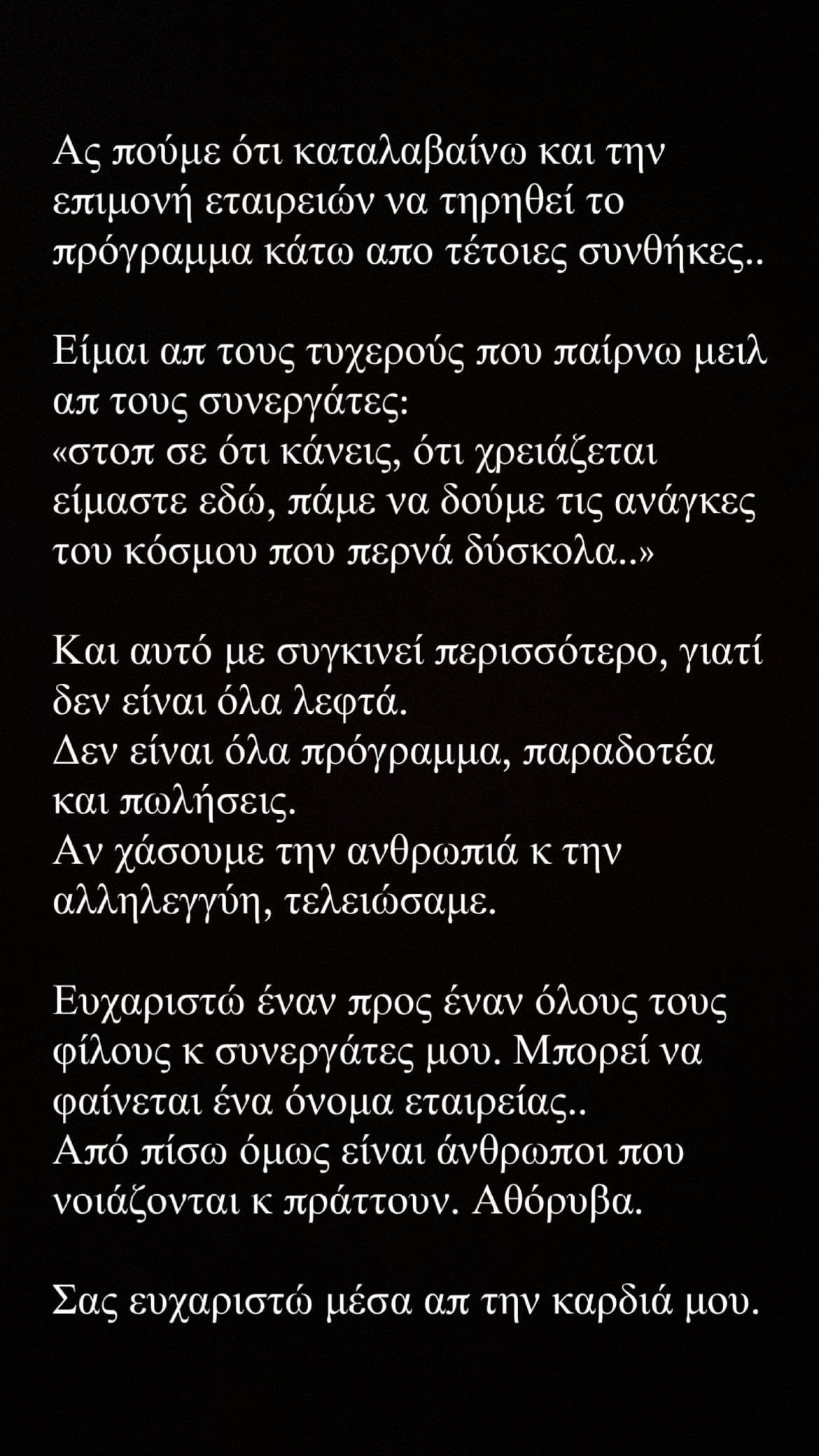 Ευχαριστώ έναν προς έναν όλους τους φίλους κ συνεργάτες μου. Μπορεί να φαίνεται ένα όνομα εταιρείας… Από πίσω όμως είναι άνθρωποι που νοιάζονται κ πράττουν. Αθόρυβα.