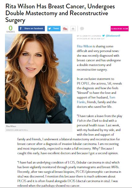 Σε διπλή μαστεκτομή και επέμβαση αποκατάστασης, λόγω διάγνωσης καρκίνου, υπεβλήθη η 58χρονη ηθοποιός Ρίτα Ουίλσον, σύζυγος του Τομ Χανκς.