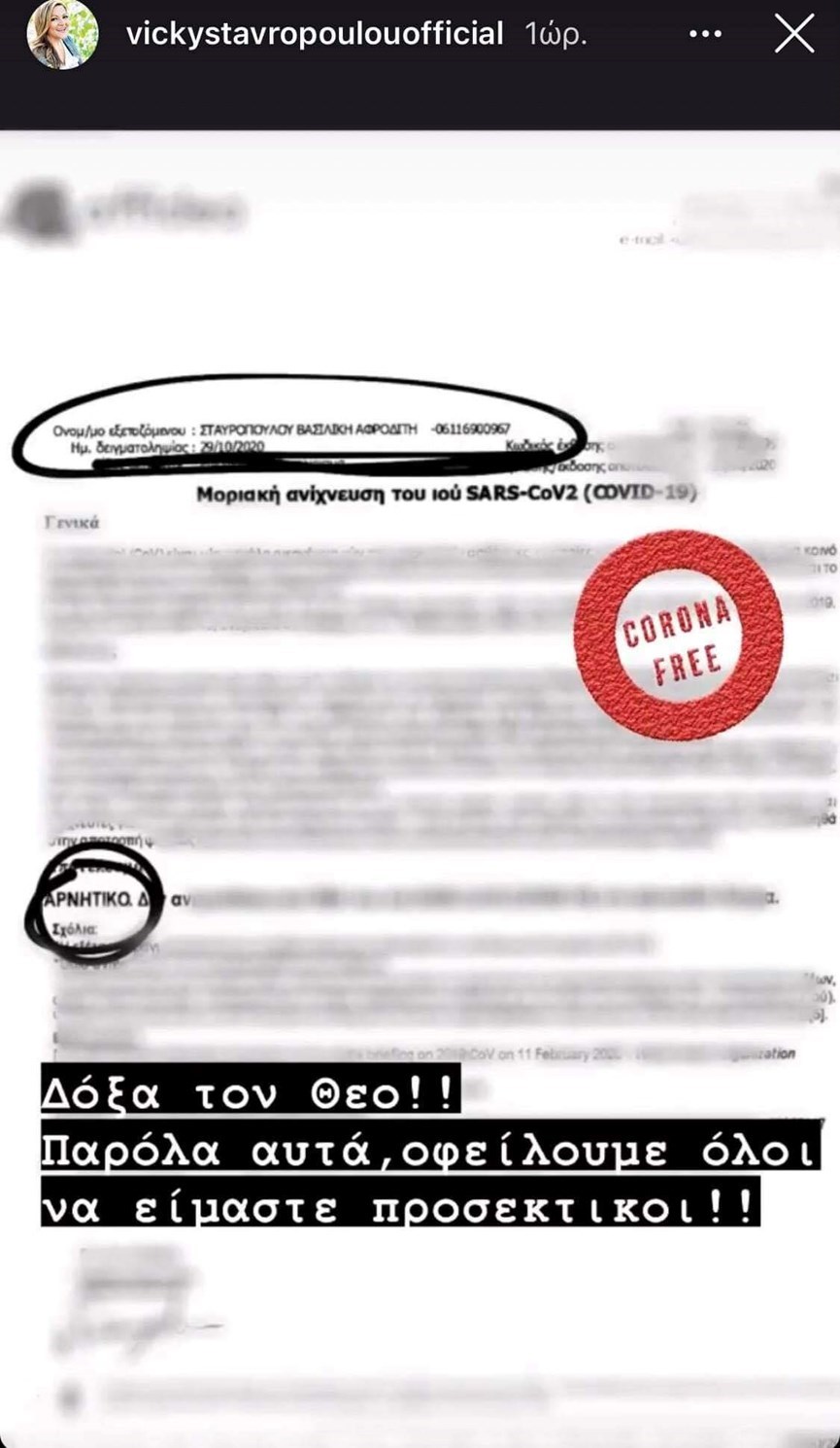 Όπως είχε δηλώσει η Βίκυ Σταυροπούλου, στην εκπομπή «Πάμε Δανάη», έψαχνε κλινική της περιοχής που να πραγματοποιεί το τεστ κορονοϊού, ώστε να ενημερωθεί για την πορεία της υγείας της. Η Βίκυ Σταυροπούλου, κατάφερε να κάνει το τεστ και μέσα από τον προσωπικό της λογαριασμό στο Instagram, ανακοίνωσε πως ευτυχώς βγήκε αρνητικό.