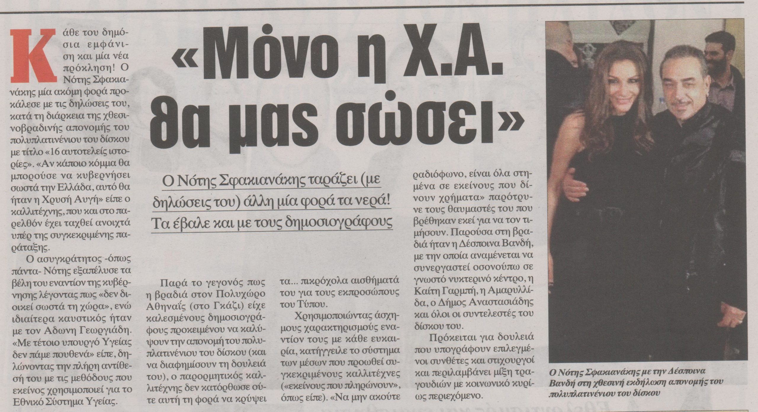 Κάθε του δημόσια εμφάνιση και μια νέα πρόκληση! Ο Νότης Σφακιανάκης μια ακόμη φορά προκάλεσε με τις δηλώσεις του, κατά τη διάρκεια της χθεσινοβραδινής απονομής του πολυπλατινένιου του δίσκου με τίτλο «16 αυτοτελείς ιστορίες».