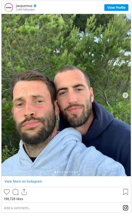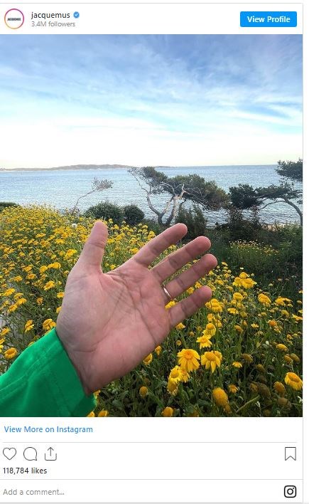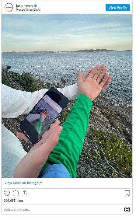 Έπειτα από λίγη ώρα, ο Jacquemus ανέβασε ακόμη δύο φωτογραφίες, που μοιάζουν με τις προηγούμενες. Στη μία φαίνονται τα χέρια και των δυο τους και στην άλλη μόνο το δικό του. “Η ζωή μου είναι τόσο καλή όσο ένα τραγούδι των Abba. Είναι τόσο καλή όσο το Dancing Queen” έγραψε ο ίδιος. Στην εικόνα ξεχωρίζει το δαχτυλίδι στον παράμεσο και τραβάει την προσοχή από το ειδυλλιακό background.
