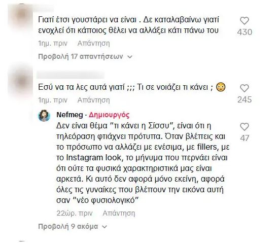 Σε σχόλια follower, η Νεφέλη Μεγκ απάντησε: «Δεν είναι θέμα “τι κάνει η Σίσσυ”, είναι ότι η τηλεόραση φτιάχνει πρότυπα. Όταν βλέπεις και το πρόσωπο να αλλάζει με ενέσιμα, με fillers, με το Instagram look, το μήνυμα που περνάει είναι ότι ούτε τα φυσικά χαρακτηριστικά μας είναι αρκετά. Κι αυτό δεν αφορά μόνο εκείνη, αφορά όλες τις γυναίκες που βλέπουν την εικόνα αυτή σαν “νέο φυσιολογικό”».