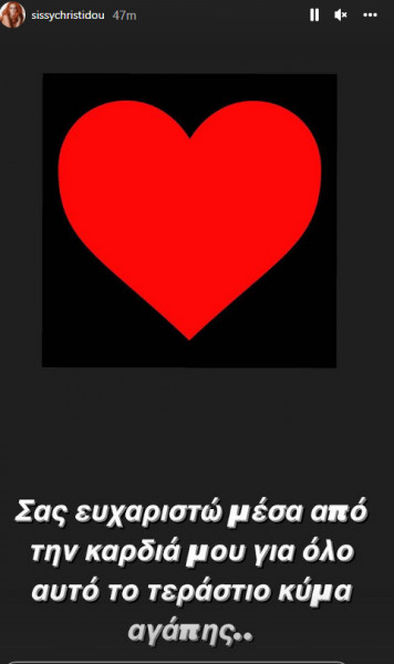 “Σας ευχαριστώ μέσα από την καρδιά μου γι’ αυτό το τεράστιο κύμα αγάπης” έγραψε αρχικά η Σίσσυ Χρηστίδου, στο πρώτο story.