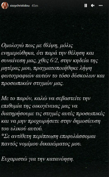 “Ομολογώ πως με θλίψη, μόλις ενημερώθηκα, ότι παρά τη θέληση και συναίνεσή μας, χθες 6/2, στην κηδεία της μητέρας μου πραγματοποιήθηκε λήψη φωτογραφιών αυτών των τόσο δύσκολων και προσωπικών στιγμών μας” συνέχισε η παρουσιάστρια και απηύθυνε έκκληση να μην δημοσιευτεί το υλικό αυτό.