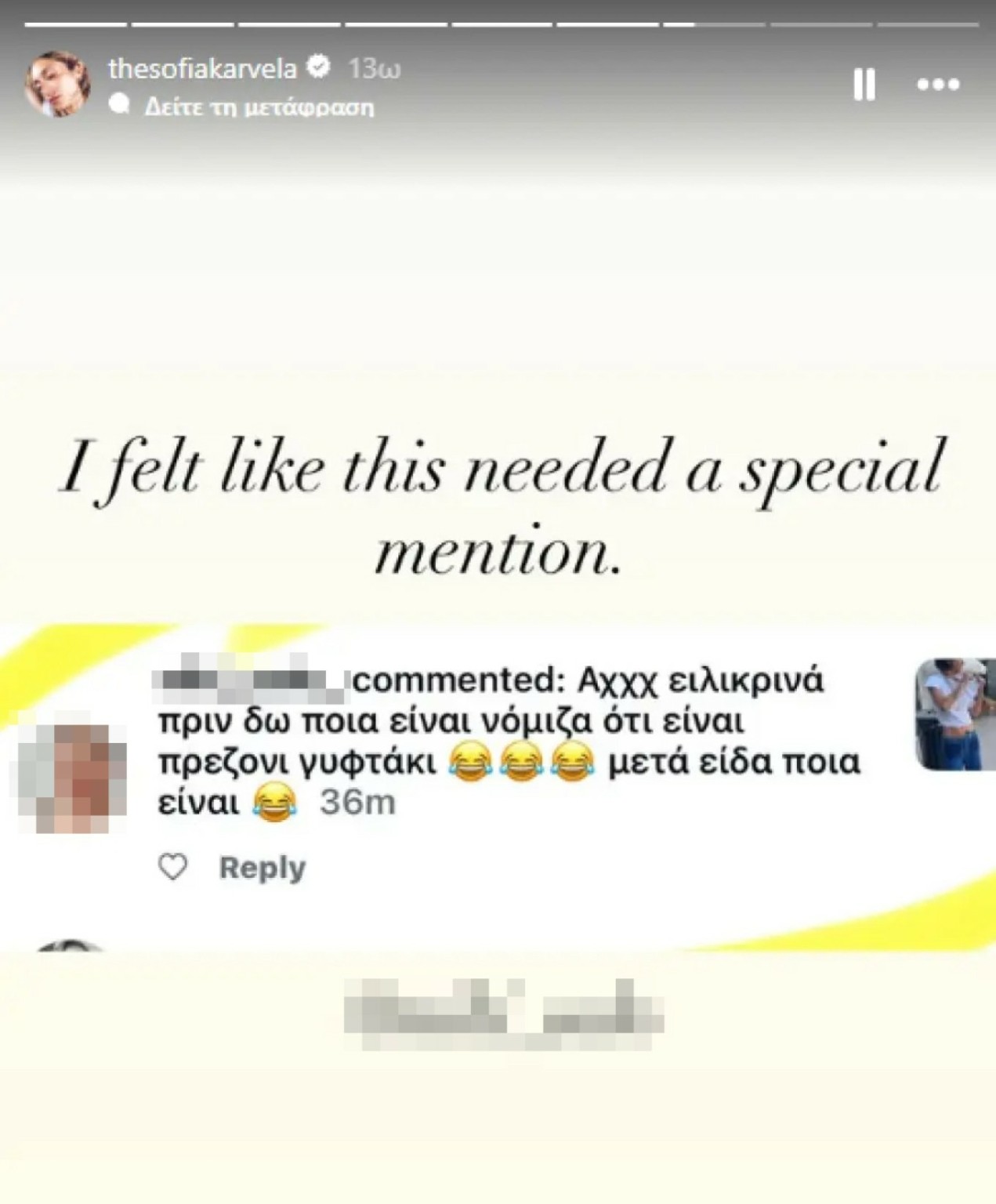 Η σχεδιάστρια μόδας αναπαρήγαγε το κακόβουλο σχόλιο σε story στο Instagram, κοινοποιώντας μάλιστα και τον λογαριασμό της γυναίκας που την προσέβαλε. «Αυτό νομίζω αξίζει ιδιαίτερη αναφορά» έγραψε ενοχλημένη.