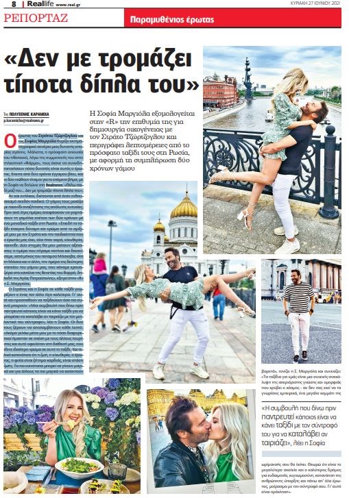 Αν και ενήλικοι, διέπονται από έναν ενθουσιασμό σχεδόν παιδικό. Ο γάμος τους μοιάζει με παιχνίδι αναζήτησης της απόλυτης ευτυχίας. Πριν από λίγες ημέρες αποφάσισαν να γιορτάσουν τη γαμήλια επέτειο των δύο χρόνων με ένα μοναδικό ταξίδι στη Ρωσία. «Επειδή το ταξίδι έπαιρνε δύναμη και χρώμα από το σμίξιμό μου με τον Στράτο και την παιδικότητα που ο έρωτάς μας έχει, όλα ήταν χαρά, ελευθερία, παιχνίδι. Δύο στιγμές θα μου μείνουν αξέχαστες: η ημέρα που πήραμε πατίνια και διασχίσαμε, κατά μήκος του ποταμού Μόσχοβα, όλη τη Μόσχα και η άλλη, την ημέρα της δεύτερης επετείου του γάμου μας, που κάναμε κρουαζιέρα στα κανάλια της Βενετίας του Βορρά, δηλαδή της Αγίας Πετρούπολης», εξηγεί στην «R» η Σ. Μαργιόλα. Η Σοφία Μαργιόλα εξομολογείται στην «R» την επιθυμία της για δημιουργία οικογένειας με τον Στράτο Τζώρτζογλου.