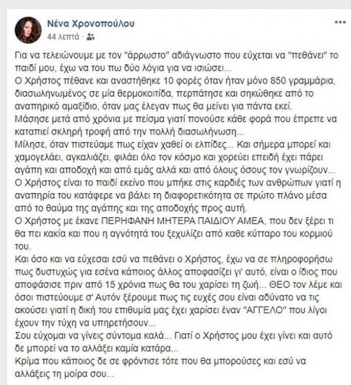 Σε κατάσταση σοκ βρίσκεται η Νένα Χρονοπούλου, μετά το μήνυμα που της έστειλε άγνωστος στο Facebook, στο οποίο χρησιμοποιεί άθλιες και χυδαίες εκφράσεις για τον γιο της, Χρήστο, που είναι παιδία ΑμΕΑ.Όπως αναφέρει η Νένα Χρονοπούλου, η ταυτότητά του είναι υπαρκτή. Η ηθοποιός απάντησε μέσω Facebook, δημοσιοποιώντας και το όνομά του χρήστη: «Καλημέρα σας υπάρχουν και αυτοί οι άνθρωποι… Δυστυχώς, το προφίλ του είναι αληθινό. Μπορείτε να το δείτε στον παρακάτω σύνδεσμο».