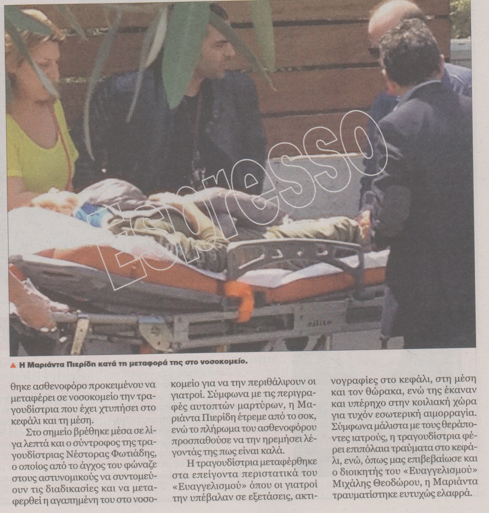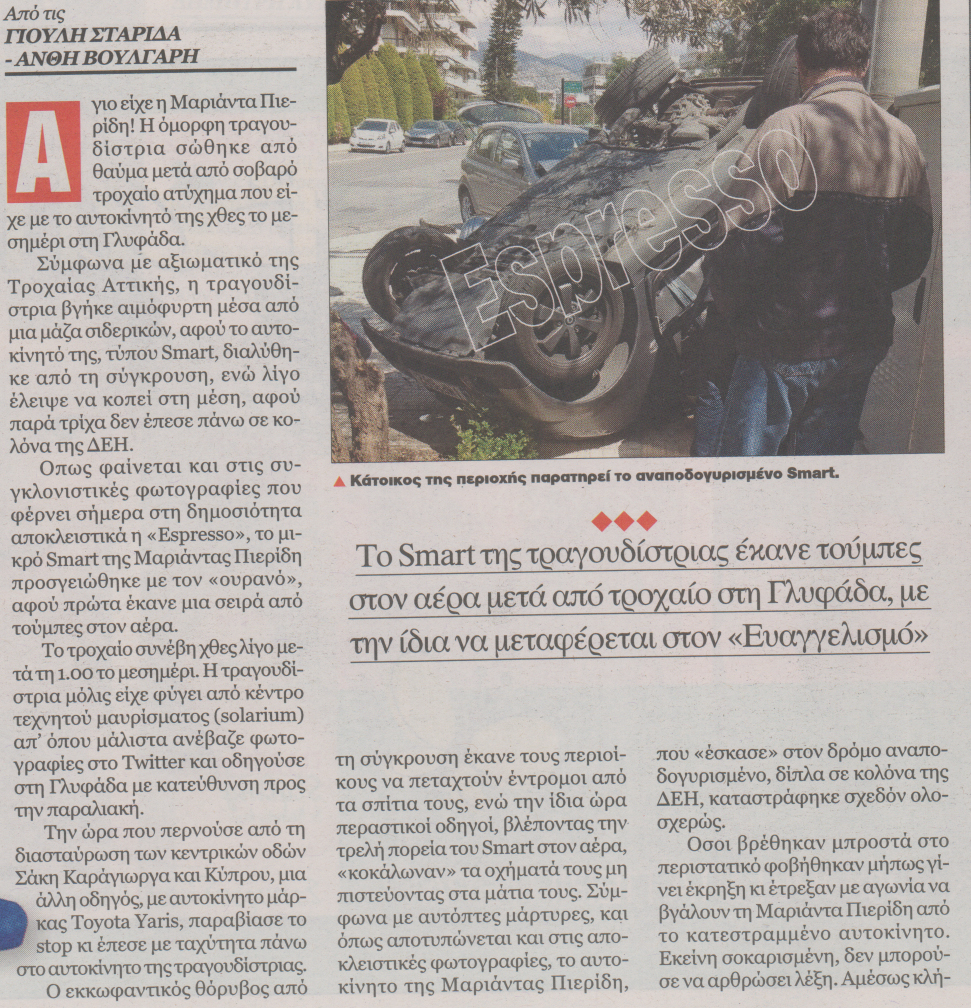 Σύμφωνα με αξιωματικό της Τροχαίας Αττικής, η τραγουδίστρια βγήκε αιμόφυρτη μέσα από μια μάζα σιδερικών, καθώς το αυτοκίνητό της, τύπου Smart, διαλύθηκε από τη σύγκρουση.