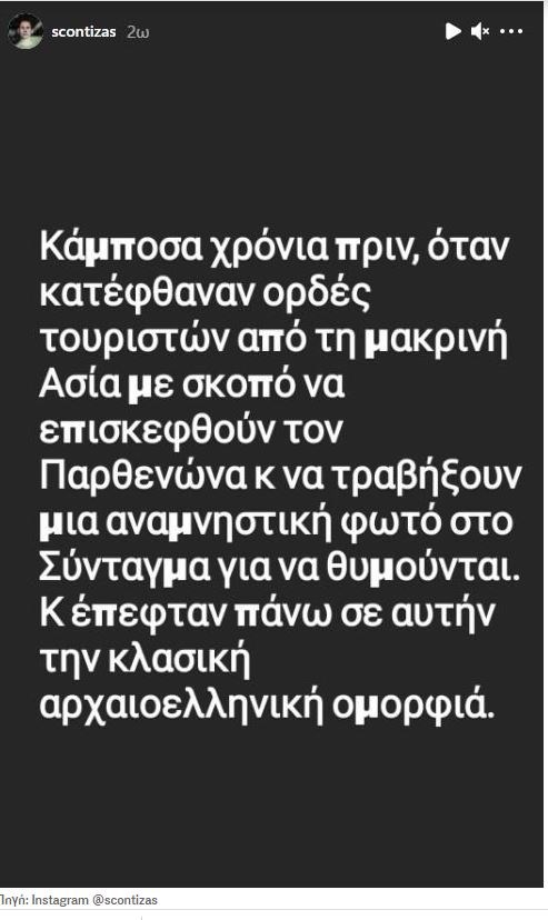 «Κάμποσα χρόνια πριν, όταν κατέφθαναν ορδές τουριστών από τη μακρινή Ασία με σκοπό να επισκεφθούν τον Παρθενώνα και να τραβήξουν μια αναμνηστική φωτό στο Σύνταγμα για να θυμούνται και έπεφταν πάνω σε αυτήν την κλασική αρχαιοελληνική ομορφιά», έγραψε ο γνωστός σεφ.
