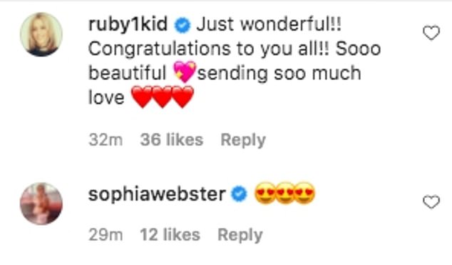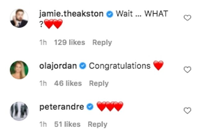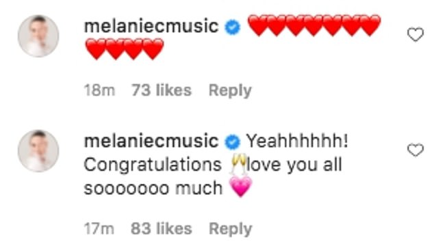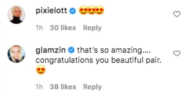 Το ίδιο μήνυμα ανήρτησε και ο Τζέιντ ταυτόχρονα. Οι φίλοι του ζεύγους αμέσως έστειλαν τις θερμές ευχές τους, όπως και τα λοιπά μέλη των Spice Girls που εξε΄φρασαν τον ενθουσιασμός του. “Ναιιιιι” σχολίασε η Mel B ενώ η Mel C έγραψε “τόσοοοοο πολλή αγάπη”.