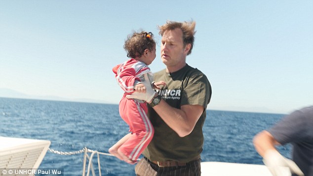 Στην παρακάτω φωτογραφία ο ηθοποιός φαίνεται να κρατάει ένα παιδί μεταναστών, που βρισκόταν σε ένα σκάφος το οποίο έπλεε ακυβέρνητο στη Μεσόγειο.