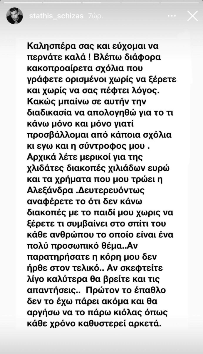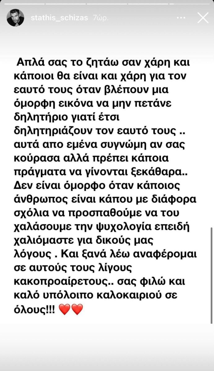 «Καλησπέρα σας και εύχομαι να περνάτε καλά! Βλέπω διάφορα κακοπροαίρετα σχόλια που γράφετε ορισμένοι χωρίς να ξέρετε και χωρίς να σας πέφτει λόγος. Κακώς μπαίνω σε αυτή τη διαδικασία να απολογηθώ για το τι κάνω μόνο και μόνο γιατί προσβάλλομαι από κάποια σχόλια και εγώ και η σύντροφος μου.
